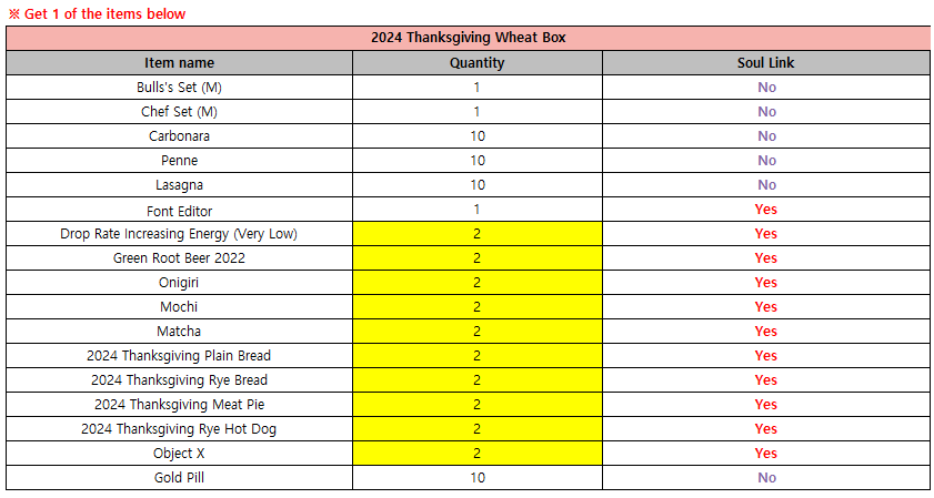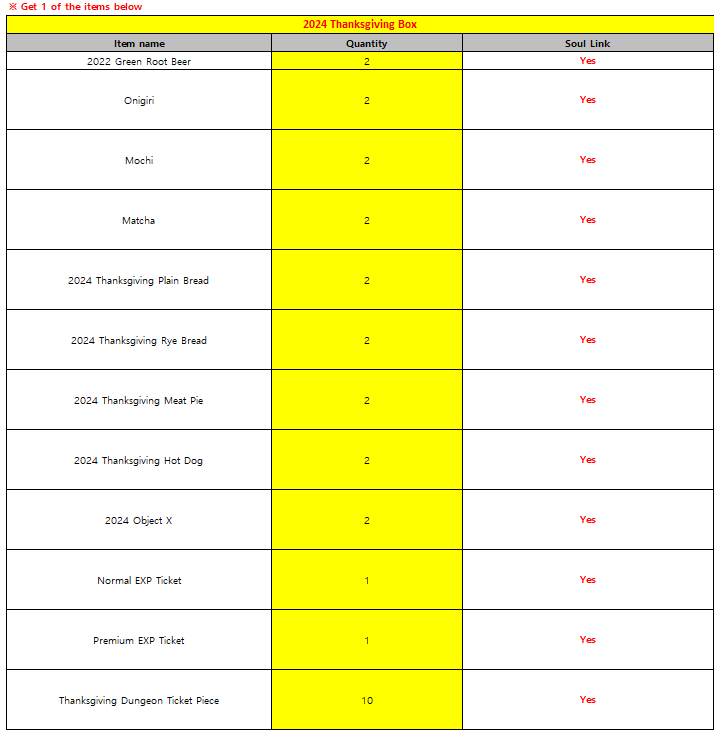 - Other items from Thanksgiving Luia is randomly dropped, no drops can be happened too.